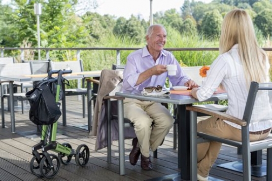 The lightweight Gemino 30 rollator is designed with your comfort and enjoyment in mind. Due to the easy height adjustment with memory function the ergonomic push handles are always in the right position. When it is time to take a break, you can sit safely on the spacious seat. Lots of things to carry? Simply use the practical bag. The unique fold-and-click system makes it easy to fold and compact to store. And did you know that you can also safely manoeuvre in tight places when your rollator is (partially) folded?